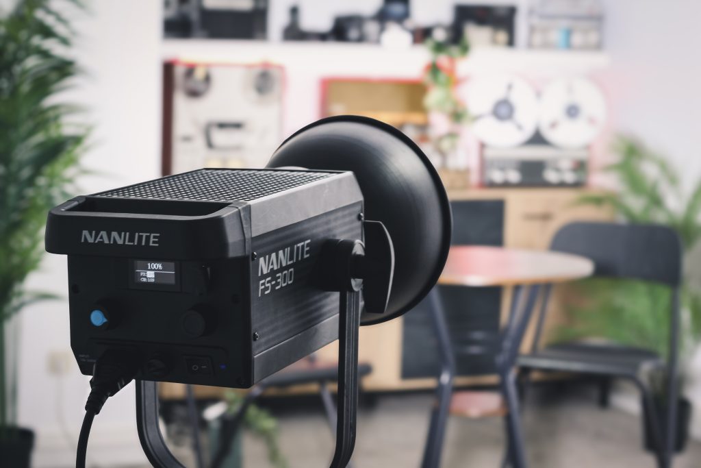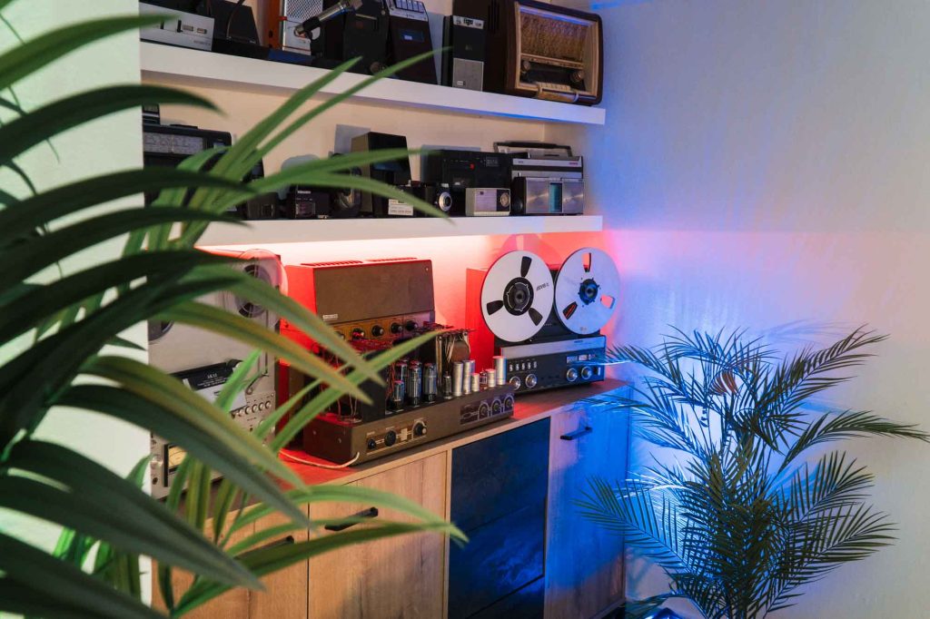 Por otro lado, disponemos de varias opciones personalizables de iluminación y escenografía, con luces RGB, mobiliario modular (sillones, mesas, taburetes) y la posibilidad de incorporar pantallas en directo con tu logo, gráficos o imágenes para darle a tu podcast una identidad visual única.